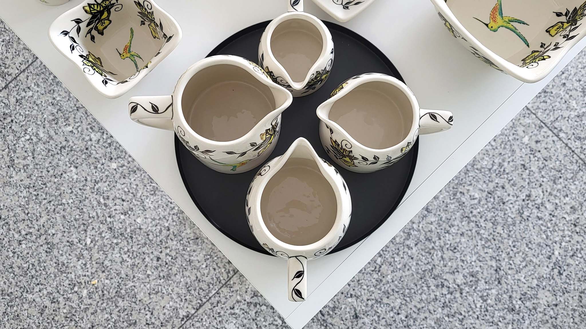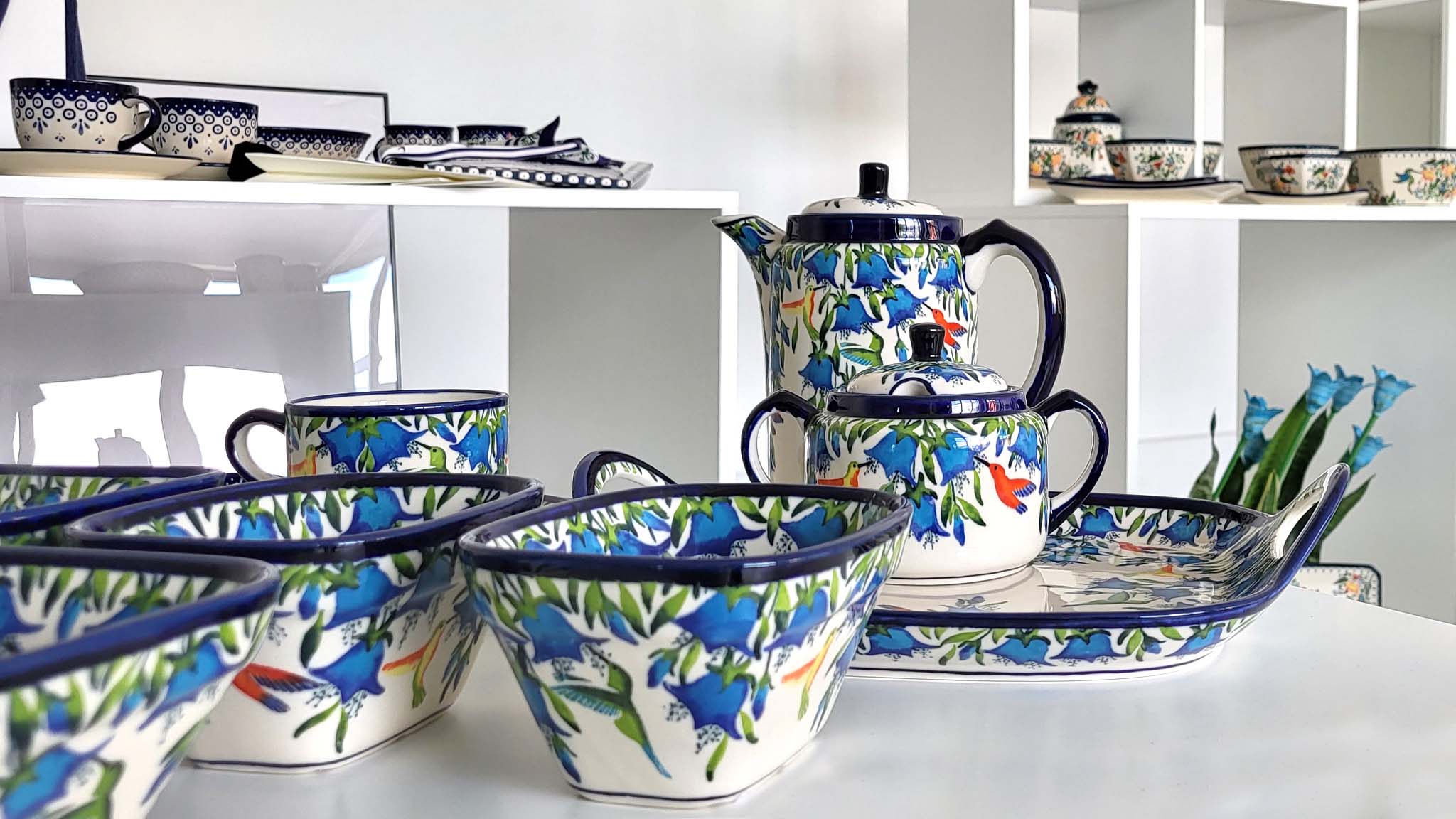 Obok biało – niebieskiego wzoru, jako jednego z najbardziej rozpoznawalnych bolesławieckich deseni, prezentujemy również dekoracje z kolibrami oraz różnorodne interpretacje motywów kwiatowych. Autorkami tych dekoracji są Adriana Dudnik-Chelalga, Aleksandra Pierzchalska, Barbara Morżkowska-Michalak, Iwona Piela oraz Małgorzata Szewc.